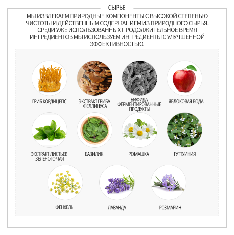 • Гриб Кордицепс - отвечает за насыщение кожи аминокислотами и питает кожу.